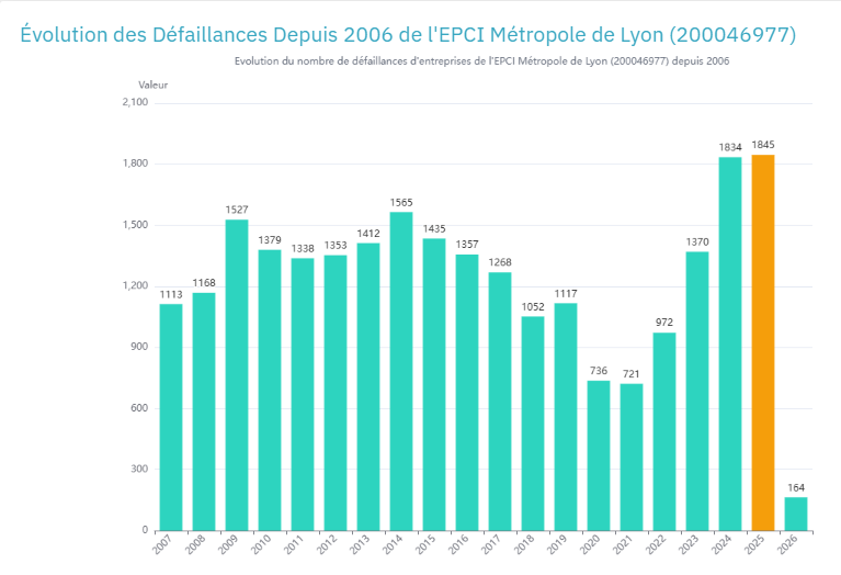 La Métropole de Lyon (EPCI 200046977), deuxième pôle économique français hors Île-de-France, connaît en 2025 une hausse historique des défaillances d’entreprises.
