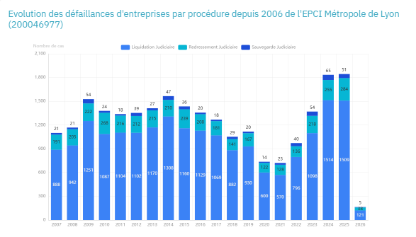 les données Faillite Tracker montrent que la Métropole de Lyon fait face à une dégradation structurelle de son tissu entrepreneurial, en particulier pour les entreprises les plus exposées aux chocs économiques.